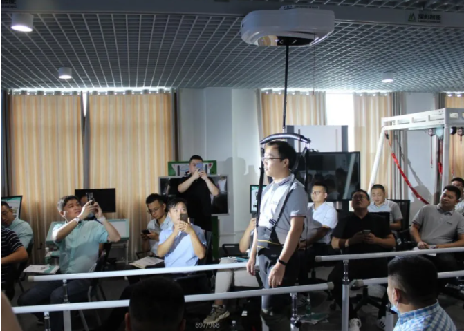 綠柏公司工作人員穿戴步行訓(xùn)練衣,步行反饋?zhàn)赃m應(yīng)康復(fù)系統(tǒng)在萬眾期待中,通過全地形場(chǎng)景,慢慢走到臺(tái)前。于此,步行反饋?zhàn)赃m應(yīng)康復(fù)系統(tǒng)正式出現(xiàn)在眾人視野之中,飛碟造型的機(jī)頭科技感十足,步行訓(xùn)練衣非常的服帖、設(shè)計(jì)簡(jiǎn)潔。大家對(duì)它的功能和治療效果充滿期待。